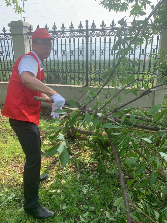圖為志愿者合影 8月13日上午,該所志愿服務(wù)隊(duì)身穿統(tǒng)一紅色馬甲,積極投身到災(zāi)后恢復(fù)工作中。 “把砍刀給我,我力氣大,讓我來?!?/span> 活動(dòng)過程中,孫明偉、杜廣勝、楊堅(jiān)等同志一行先查看了配電房周邊綠化帶,看到有樹木倒伏,壓在防護(hù)網(wǎng)上,存在較大安全隱患,他們二話不說立即手拿砍刀,對(duì)樹木進(jìn)行切割處理,并由李學(xué)平、包德福等人安排拉車將斷木等清理干凈。