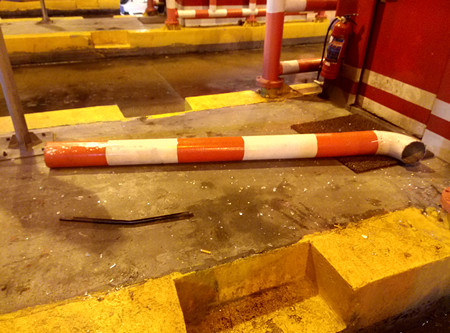 圖為被撞壞的收費崗?fù)?/span> 該車在臺州收費站下高速時,由于車身太長,司機沒察覺到車后半部分所載的傾斜的大米,出收費站時也沒有留意觀看后視鏡,導(dǎo)致傾斜的大米直接把五號收費亭防撞鋼管和收費亭邊窗玻璃撞壞,發(fā)出巨大響聲。收費班長陳幸聞聲后立刻跑到崗?fù)げ炜?/span>,五號車道右前方的防撞欄被撞斷,右側(cè)玻璃破碎,五號崗?fù)?nèi)工作臺上、地面上全是玻璃碎渣,所幸當時崗?fù)?nèi)無人在崗,沒有造成人員受傷。 陳幸一邊通知負責(zé)路產(chǎn)勘察賠償?shù)娜藛T到場,一邊協(xié)助司機先將傾斜的幾包貨物卸下,再將車移到外廣場,以免堵住車道,影響四號車道正常通行。最后經(jīng)勘察定損,司機按規(guī)定賠償了500元。 在此,筆者提醒廣大司機朋友,過收費站時一定要慢行,注意四周的收費設(shè)施,并及時檢查所載貨物有無歪斜,既保證自己及他人的安全,也減少不必要的損失。 余娟娟