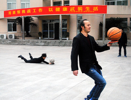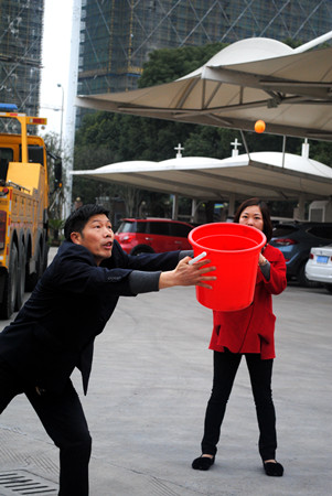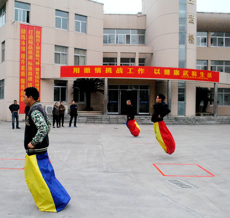 圖為“跳袋鼠”比賽 上午9點(diǎn)整,隨著臺(tái)州收費(fèi)所所長(zhǎng)、分工會(huì)會(huì)長(zhǎng)王小勇的一聲令下,趣味競(jìng)技活動(dòng)正式拉開(kāi)帷幕。此是自分工會(huì)成立以來(lái)第一次組織的妙趣橫生的集體活動(dòng),參加人員個(gè)個(gè)摩拳擦掌、躍躍欲試,有的迫不及待地在一旁先練開(kāi)了。 此次趣味活動(dòng)本著“重在參與、愉悅身心、全民健身”的原則,以豐富員工健康向上的業(yè)余文化生活為目的,分集體和個(gè)人兩種比賽方式。集體項(xiàng)目有“二龍戲珠”、“齊心協(xié)力”、“我是喬丹”、“集體跳繩”共4項(xiàng);個(gè)人項(xiàng)目有“絕對(duì)公平”、“夾豆比賽”、“單人跳繩”、“跳袋鼠”、“車輪滾動(dòng)”共5項(xiàng)。在集體項(xiàng)目中,各隊(duì)配合默契,勇往直前;單人賽中,各位員工積極參與,有幾個(gè)為爭(zhēng)第一不小心摔倒,手掌擦破了皮,褲子摔破了也絕不放棄,爬起來(lái)繼續(xù)參加比賽,堅(jiān)持到最后。