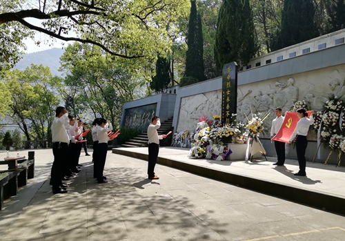 圖為敬獻(xiàn)鮮花 九峰烈士陵園始建于1956年,埋葬著20世紀(jì)50年代為國捐軀的120余位革命先烈。墓區(qū)內(nèi)青松翠柏環(huán)繞,墓前豎有一座“革命烈士永垂不朽”的石碑。上午10時(shí)許,祭掃儀式開始,全體人員懷著無比崇敬的心情向革命先烈鞠躬默哀,緊接著依次走到紀(jì)念碑前敬獻(xiàn)鮮花,表達(dá)對(duì)革命先驅(qū)的悼念與緬懷之情。在紀(jì)念碑前,全體黨員重溫入黨誓詞“我志愿加入中國共產(chǎn)黨,擁護(hù)黨的綱領(lǐng),遵守黨的章程......”