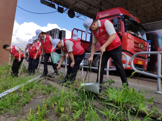 活動現(xiàn)場,身著紅馬甲的志愿者們,拿著垃圾夾、垃圾袋、掃把、畚斗等工具,重點(diǎn)清理收費(fèi)站內(nèi)外廣場的煙頭和白色垃圾。由于上下高速時(shí)有不少司乘人員直接把垃圾丟向兩側(cè)邊溝,導(dǎo)致收費(fèi)所兩側(cè)邊溝垃圾較多。盡管天氣炎熱,但志愿者們自行分組,三人一組、五人一隊(duì),充分發(fā)揮不怕苦不怕累不怕臟的精神,并互相配合集中對一些死角進(jìn)行清理。