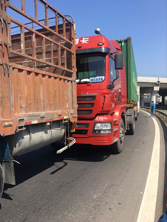上圖為事故車輛 當天中午,在副站崗亭旁站的工作人員發(fā)現(xiàn)該所前方出口不遠處有貨車停在那里不動,以致后面車輛無法通行。工作人員隨即跑到前方查看情況,原來是三輛貨車發(fā)生追尾,其中有一輛車車頭被撞得凹陷,擋風玻璃也被撞碎,在了解事故現(xiàn)場無人員受傷后,工作人員馬上向監(jiān)控中心匯報情況。由于事故車輛較大面積滯留,導致后方車子堵到主線上,一些不明情況的駕駛員在車里使勁按喇叭催促,現(xiàn)場充滿焦躁情緒。 如何盡快疏通道路?正在食堂吃飯的一班班長潘慶耀放下碗筷跑到事故現(xiàn)場,同工作人員叫前面受損較少的事故車輛先把車子開出收費站,再讓第三輛受損嚴重的車子試著發(fā)動車子開出去,所幸三輛車子都能開離車道。在將地上的破損碎片清理到車道兩旁后,工作人員繼續(xù)指揮車輛向前行駛,收費內(nèi)廣場在較短時間內(nèi)恢復了正常通行。 沈芬芳