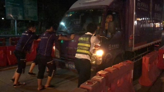 圖為收費(fèi)員幫助司機(jī)將故障車輛推出車道 8月15日凌晨1點(diǎn)多,溫嶺西收費(fèi)所征費(fèi)二班安全員在日常巡邏時(shí)發(fā)現(xiàn)一輛小型貨車停在進(jìn)口內(nèi)廣場(chǎng),在詢問(wèn)司機(jī)后得知車輛因出現(xiàn)故障導(dǎo)致無(wú)法發(fā)動(dòng)。安全員當(dāng)即叫來(lái)旁站人員,與兩個(gè)司乘人員一起用力,慢慢地將該車推出車道。在婉拒了司機(jī)遞香煙的好意后,安全員囑咐司機(jī)盡快聯(lián)系人員前來(lái)解決,后回到崗位繼續(xù)工作。