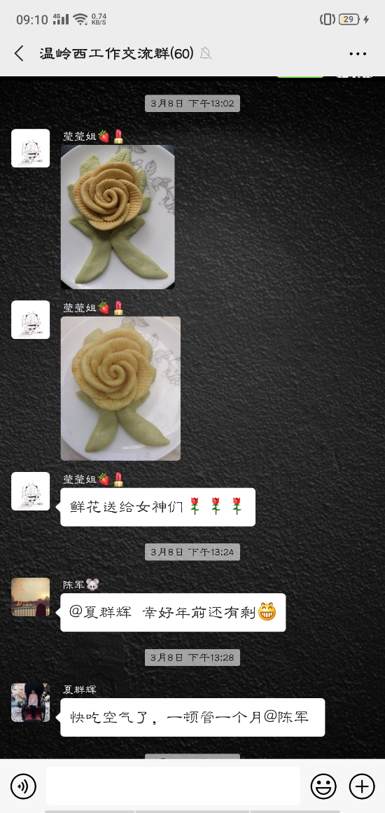 活動中,大家的參與性都很高,紛紛在微信群內(nèi)曬出自己制作的美食:鹽焗雞、可樂雞翅、蔥油角角魚、溫嶺小吃豬肉飯、玫瑰南瓜饅頭……紛紛亮出了自己的拿手好菜,在群里談?wù)摰脽峄鸪斓耐瑫r,也不忘介紹一下自己做的菜。甚至很多男同事也紛紛曬出自己的最佳廚藝,祝福女同胞節(jié)日快樂。
