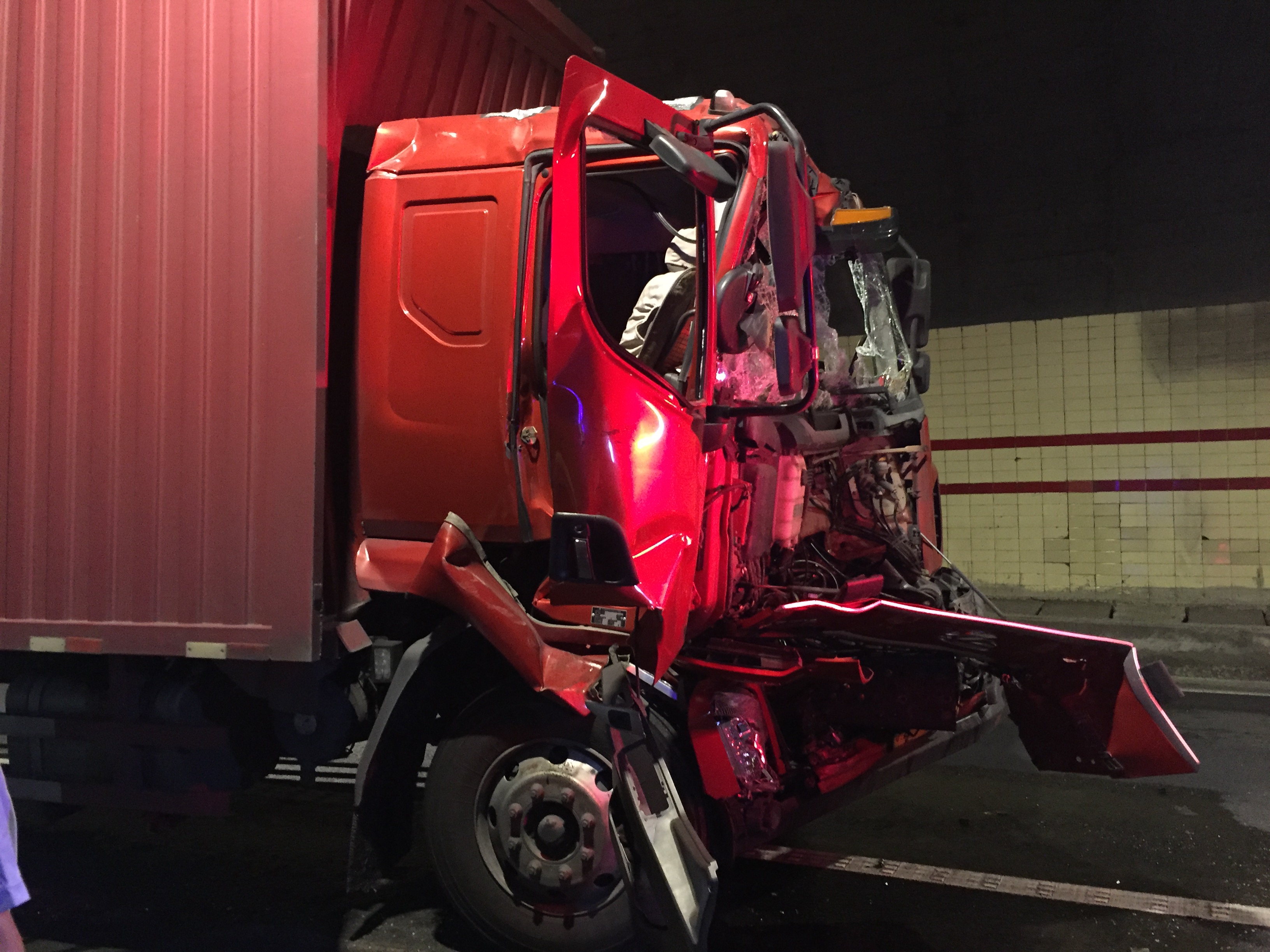 圖為事故車輛 接警后,執(zhí)勤隊(duì)員立即奔赴現(xiàn)場,做好車輛預(yù)警工作。現(xiàn)場兩輛廂式貨車停在慢車道上,后貨車的副駕駛室被擠壓得嚴(yán)重變形,幸好副駕駛位置無人,否則后果不堪設(shè)想。受傷的司機(jī)坐在電纜溝上,右手臂一直流血,意識清醒。見司機(jī)受傷,隊(duì)長通知中控員撥打救護(hù)車。前車已經(jīng)停在電纜溝上,但是車輛不能移動,隊(duì)員們向司機(jī)詢問之后才了解,前車漏機(jī)油,兩車都需要拖車。隊(duì)員們一邊在隧道內(nèi)疏通交通一邊在等候救護(hù)車和拖車,16:26分,救護(hù)車到達(dá)現(xiàn)場將受傷司機(jī)帶走,17:50分,拖車將兩輛事故貨車拖離,現(xiàn)場恢復(fù)通車。該起事故造成隧道內(nèi)車輛緩行兩個(gè)小時(shí),期間封道十多分鐘,事故原因是前車有故障緩慢行駛,因無任何警示標(biāo)志,后車沒有注意而造成追尾。 在此提醒各位司機(jī)朋友,由于隧道內(nèi)外亮度不同,進(jìn)入隧道請?zhí)崆伴_燈減速慢行,在行車過程中要注意前面路況,發(fā)現(xiàn)有問題及時(shí)減速慢行,并保持安全車距。如遇突發(fā)狀況,車子無法正常行駛時(shí),為了自已和他人的安全,請及時(shí)報(bào)警并做好相應(yīng)警示標(biāo)志,防止二次事故的發(fā)生。 陳旦平
