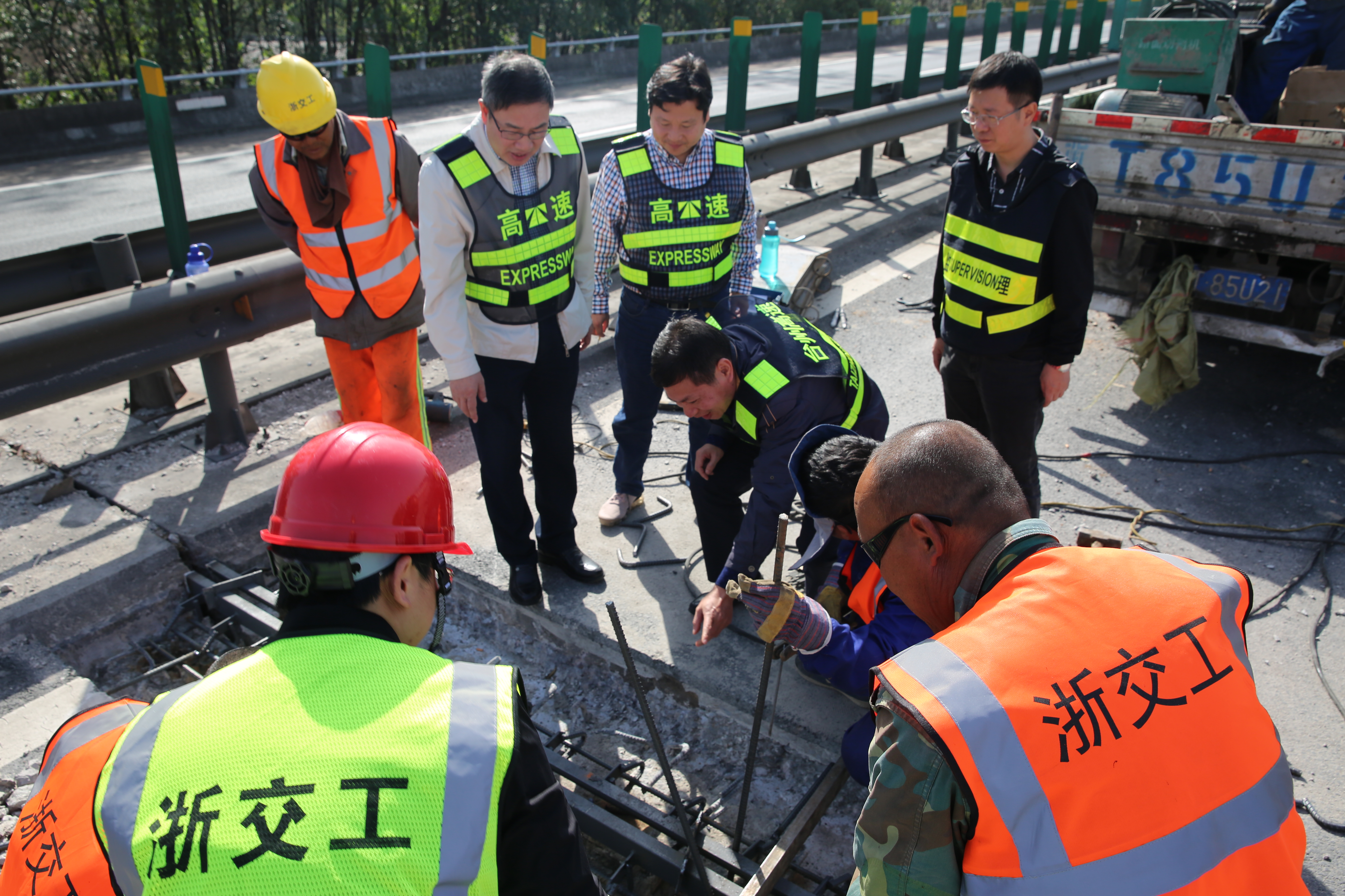 10月31日上午,臺州高速集團董事長陳文波在總工程師江輝的陪同下,趕赴甬臺溫高速公路溫州方向黃土嶺隧道、橋梁維修加固工程施工現(xiàn)場,檢查施工進展情況。