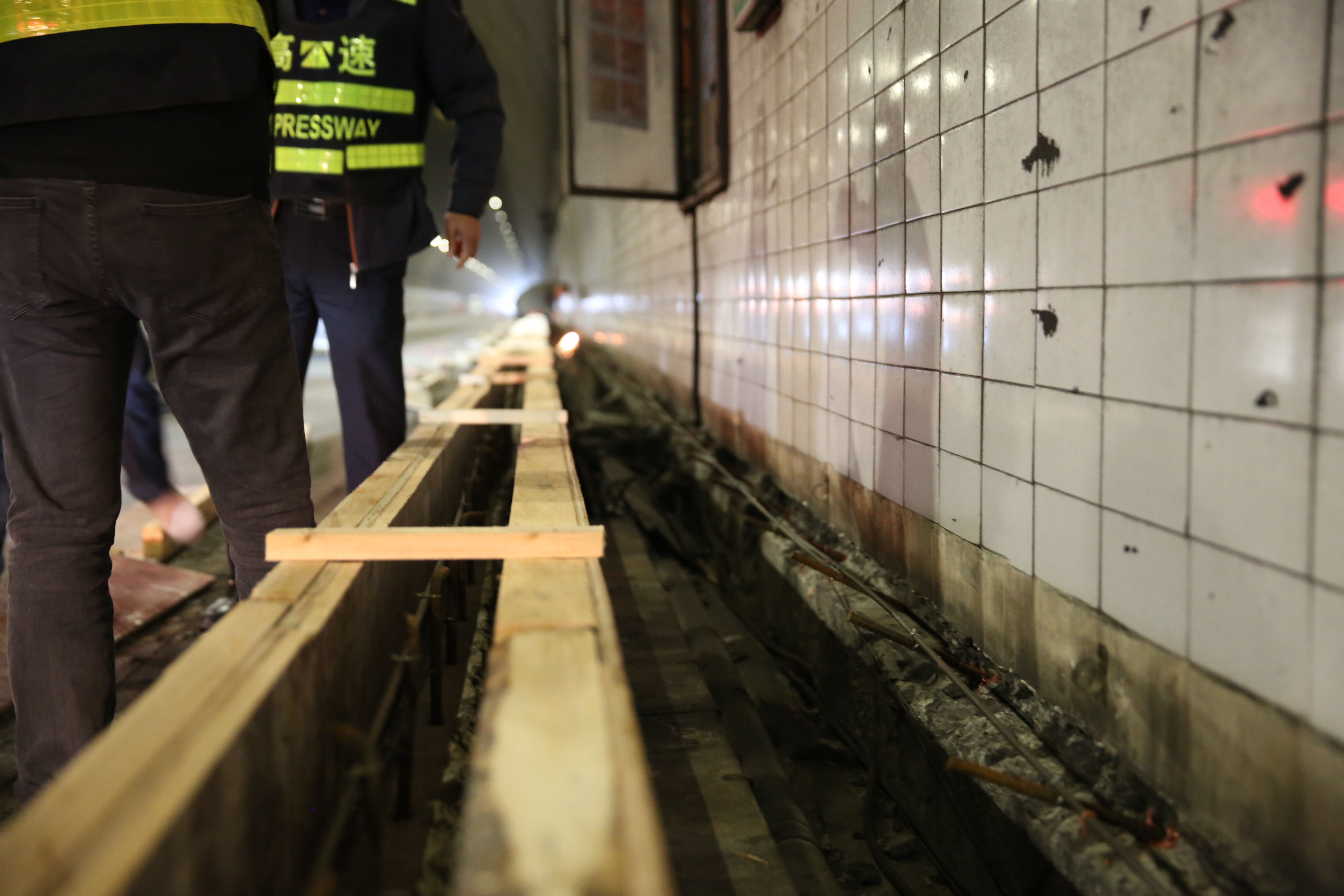 黃土嶺隧道原本設(shè)計邊溝高度25公分,目前車流量已超飽和狀態(tài),極易發(fā)生事故,一旦事故發(fā)生,車輛容易騎上邊溝,撞擊隧道壁,存在重大安全隱患,現(xiàn)有邊溝設(shè)計高度已不能很好滿足安全運營需要。為了解決這個問題,此次隧道施工將抬高邊溝至40公分。施工現(xiàn)場,施工人員正在分成多組進行邊溝植筋立模。施工現(xiàn)場,多卷巨大的電纜線已經(jīng)進場,施工人員正在分成多組進行邊溝植筋立模。