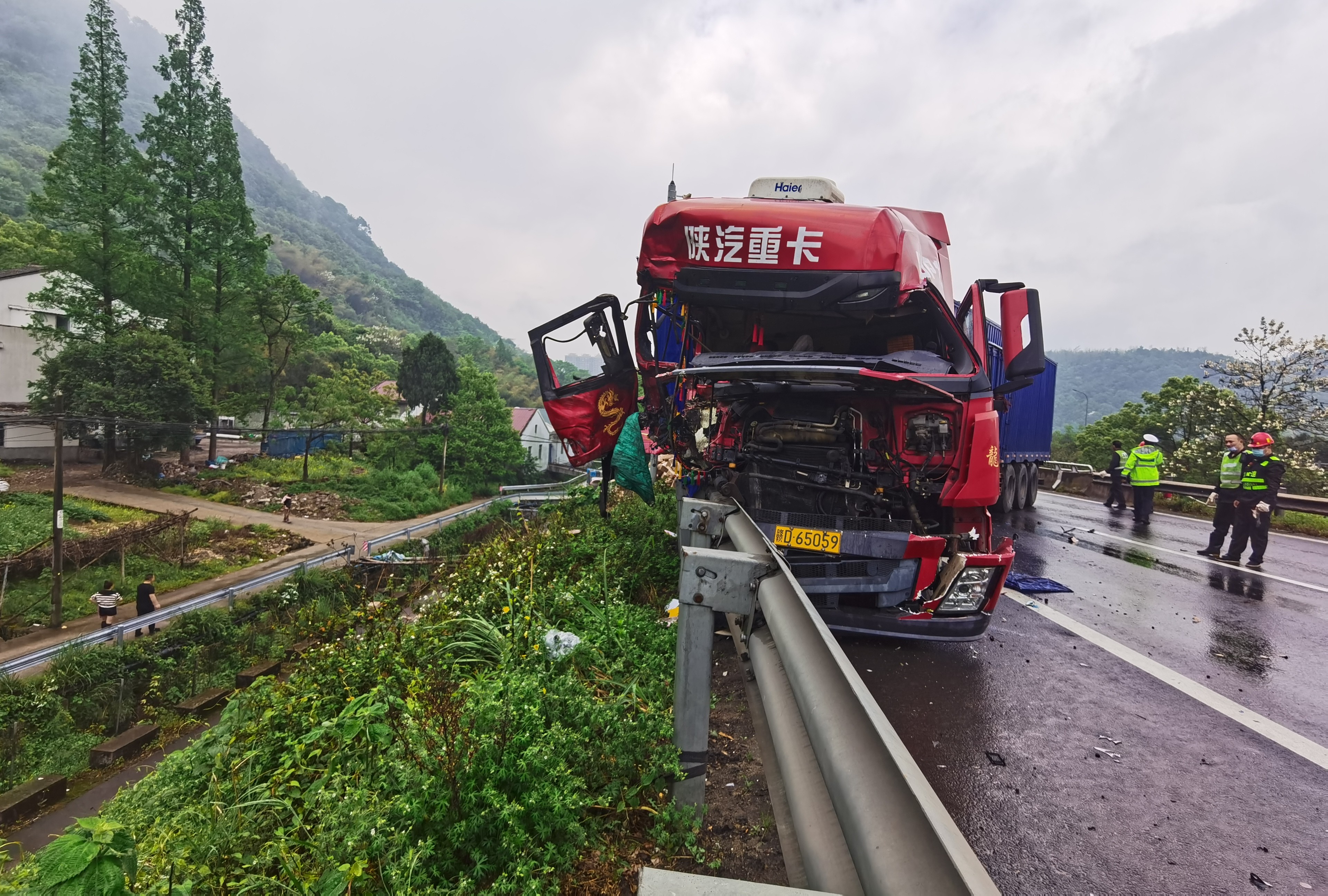 緊急救援!黃土嶺隧道口一輛大貨車避讓不及追尾后撞上護(hù)欄 4月13日上午8點(diǎn)30分左右,天突下大雨,黃土嶺隧道附近傳出一聲巨響,發(fā)生了驚魂一幕。 距離寧向洞口200米處,有一輛14米長的箱式大貨車避讓不及撞上了一輛平板小貨車,隨即又撞到隔離護(hù)欄,整個(gè)車頭瞬間被撞得七零八碎嚴(yán)重變形,車尾橫向路面且僅留小車能駕駛的空間。被追尾的平板貨車所載貨品散落一地,高速路上、護(hù)欄外一片狼藉,所幸無人員傷亡,大貨車司機(jī)膝蓋輕微撞傷。