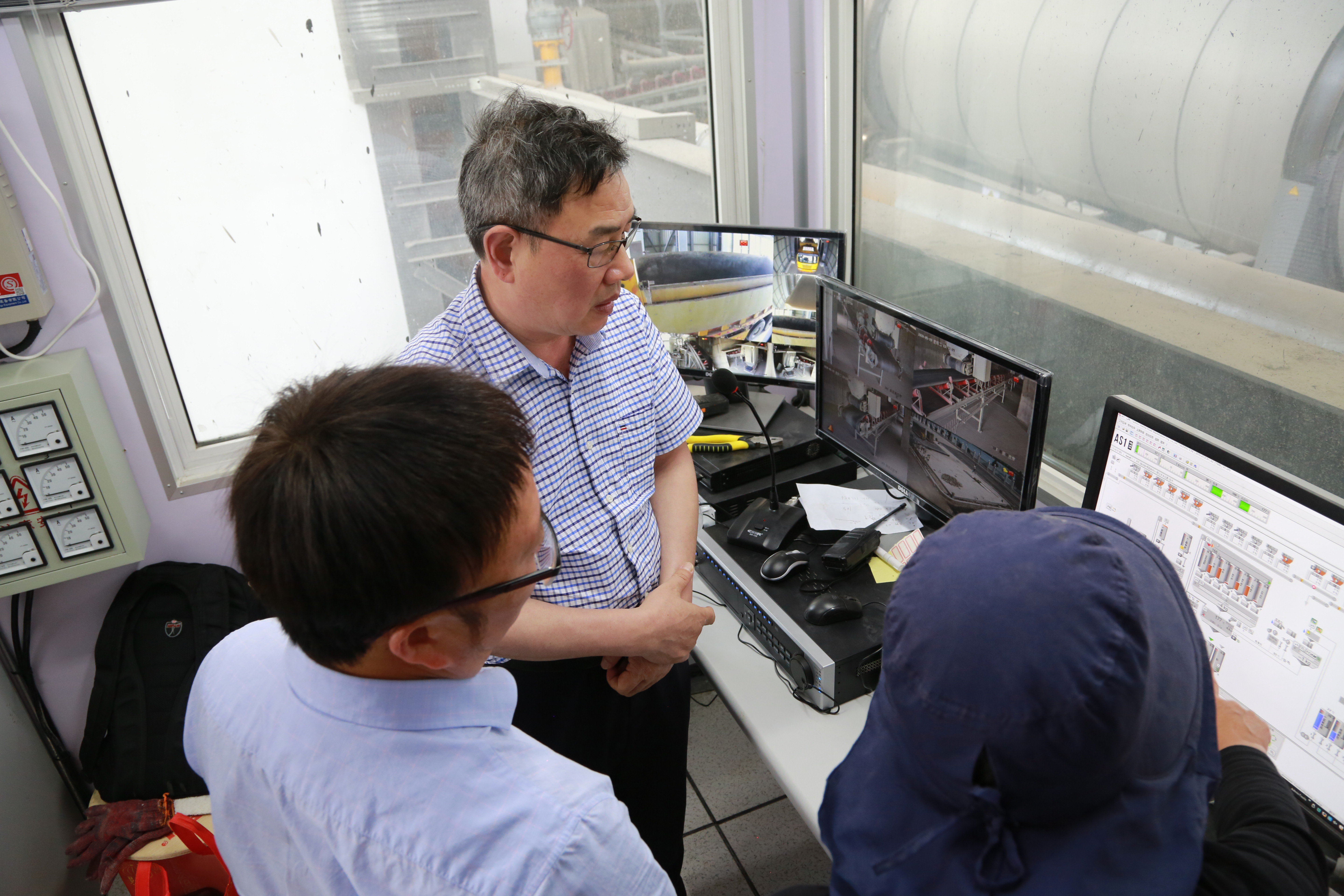 圖為陳文波一行在山海公司瀝青拌合站現(xiàn)場(chǎng)調(diào)研
