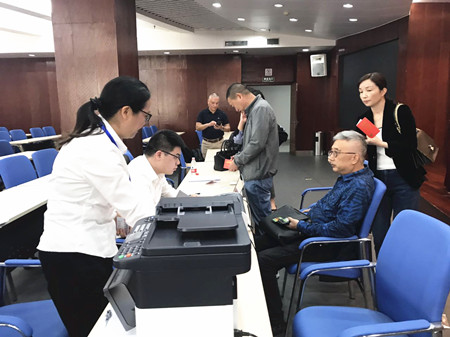 上圖為工作人員在溫嶺市政府設(shè)置流動點(diǎn)為股東服務(wù)