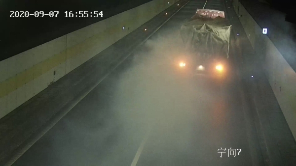 9月7日下午16點53分,一輛大貨車駛?cè)雽幭螯S土嶺隧道,打著雙閃燈,整車發(fā)散出濃濃的煙霧,造成隧道內(nèi)能見度極低。