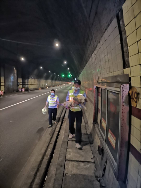 為確保安全,執(zhí)勤隊員們帶上手套,拿著掃把和麻袋,到達現(xiàn)場后發(fā)現(xiàn)是一只白色的拉布拉多犬,它一動不動地趴著,可憐巴巴地看著隧道里的車子極速而過,很顯然小狗感覺到害怕,知道趴在這里才是最安全的。隧道所安保人員陶文輝再三確認小狗沒有攻擊意圖后,試著慢慢靠近它,給它喂食香腸,并耐心安撫,直至順利地將其抱起,帶上了巡邏車。狗是靈性的動物,認準了第一個抱起它的陶文輝,乖乖地依偎在他的懷里。 此前,隧道里從未出現(xiàn)寵物狗被遺忘的事,執(zhí)勤隊長忙回到監(jiān)控室查看錄像,準備幫它尋找主人,經過仔細查找終于發(fā)現(xiàn)隧道里有過一次大堵車,小狗就是那個時候被主人遺忘的。按照時間推算,這條小狗已經在隧道里呆了近14個小時,還好它聰明,趴在那兒一動不動沒有到處亂跑。最后經過半個多小時的查找,隊長終于與車主取得聯(lián)系,晚上22點左右,車主來到大溪嶺隧道所認領,多次感謝我們對小狗的救援和照顧。 孫鵬