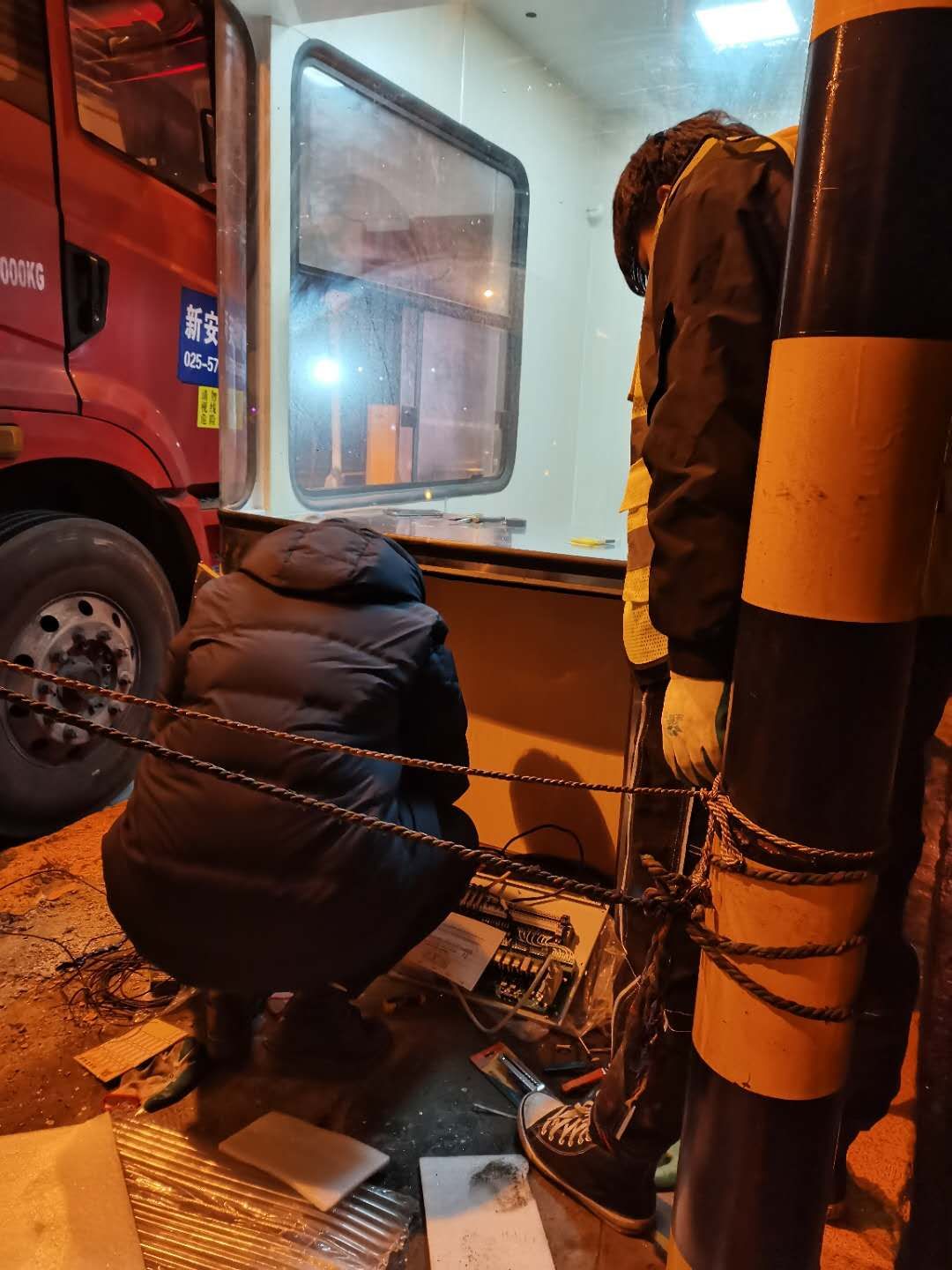 21日下午4點(diǎn)左右,訂購的新崗?fù)ず蛽p壞的設(shè)備設(shè)施陸續(xù)到位,中心值班人員協(xié)同設(shè)備廠家一起將其安放并固定至車道原位置。因崗?fù)A倒時拉斷了底下很多線纜,在拆除設(shè)備時又因?yàn)榫o急搶修需要沒有作相應(yīng)標(biāo)注,現(xiàn)場各種電線接頭雜亂如麻。考慮到夜間查線、接線存在一定的安全隱患,也不利于施工,搶修人員決定第二天再戰(zhàn)。