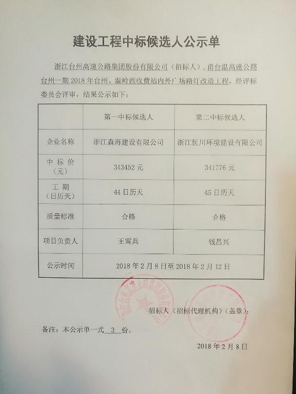 2018年臺(tái)州、溫嶺西收費(fèi)站內(nèi)外廣場(chǎng)路燈改造工程中標(biāo)候選人公示單