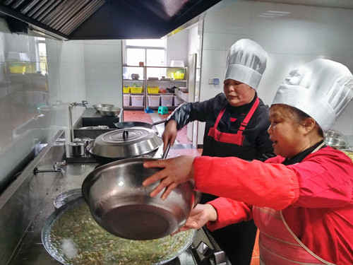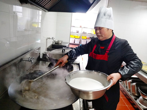 浸了一夜的早米,用石磨磨成米漿,細(xì)膩而幼滑,被靜置在盆里?!耙话愣加妹追叟菟诟写植?,而且吃起來沒有香頭。”利花一邊說,一邊將香腸切碎與豆腐、冬筍、胡蘿卜、芹菜、香菇、蠶豆瓣翻炒著。旁邊的大鍋里,長長的豆面在骨頭湯里翻滾著,像一棵棵舞蹈的海草。徐徐倒入的米漿,被不停地?cái)嚢?,“要是粘到鍋,就?huì)有焦糊味,這鍋羹就算廢了。”米漿好像不夠,利花有些懊惱,“要是在家里,米漿都會(huì)多準(zhǔn)備一些,不夠就隨手添,我?guī)У竭@里就這些,也沒得加了?!本徒性谝贿呑鰩褪值拿妹脤毣ㄓ妹娣酆蜕椒郏ㄒ簿褪欠矸郏剿杵饋?,倒入鍋里,湯漸漸濃稠起來,倒入之前炒好的配料,加上切得細(xì)細(xì)的綠綠的芥菜梗、芥菜葉、海蠣,鍋里不時(shí)冒起大泡,香氣四溢。 為照顧吃不慣糟羹的同事,食堂還準(zhǔn)備了一鍋甜的山粉糊。來自臺(tái)州各縣市區(qū)的同事,按各自飲食習(xí)慣選擇了咸的或甜的。有說芹菜的味道蓋過了芥菜清香的,有說沒有加入芋頭口感不夠糊的,但撲鼻的香氣和濃厚豐富的口感立刻讓人忘了挑剔。對(duì)我來說,碧綠的芥菜葉和白胖的海蠣肉是整碗羹的顏值擔(dān)當(dāng)和靈魂所在。 每個(gè)元宵節(jié),對(duì)于在崗的同事們是沒有花燈可看、沒有燈謎可猜的,也不能與家人聚在一起吃羹。車道上此刻正是流量高峰期,大家匆匆吃完,都要趕著上崗。食堂大姐把多出的糟羹和山粉糊放進(jìn)蒸飯鍋保溫,叮囑大家下班后再來吃點(diǎn),這個(gè)吃了不扛餓。此時(shí),除了食物最能體現(xiàn)節(jié)日氣氛外,還有那一份特意為你留著的溫?zé)岣屓烁袆?dòng)。 鄭瑛芝