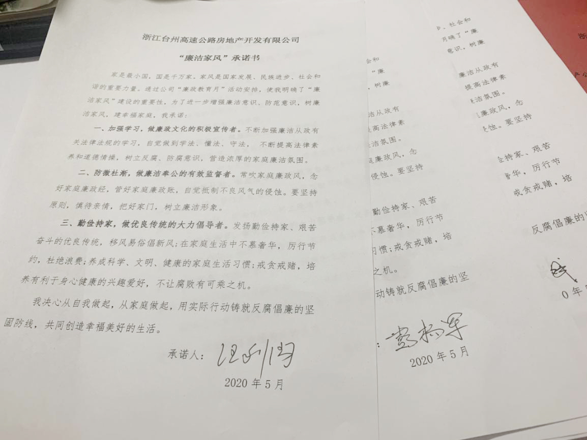 圖為全體黨員觀看廉政教育短視頻《國畫》  圖為簽訂“廉潔家風(fēng)”承諾書 根據(jù)集團公司《關(guān)于組織開展“廉政教育月”活動的通知》文件要求,為推動“不忘初心、牢記使命”主題教育常態(tài)化,深入學(xué)習(xí)貫徹黨的十九大和十九屆二中、三中、四中全會及十九屆中紀(jì)委四次全會精神,嚴(yán)守黨的政治紀(jì)律和政治規(guī)矩,更好地落實黨風(fēng)廉政建設(shè)有關(guān)要求,高速房產(chǎn)公司黨支部組織了這次專題活動。全體參會人員一起觀看廉政教育視頻,宣讀“廉潔家風(fēng)”倡議書,簽訂“廉潔家風(fēng)”承諾書,開展“廉潔文明家風(fēng),黨員干部示范”大討論。 此次黨風(fēng)廉政專題活動進一步增強了黨員干部的廉潔意識、防范意識,起到帶頭正品行、立家規(guī)、嚴(yán)家教、樹家風(fēng)建設(shè)的表率作用,以好家風(fēng)促黨風(fēng)帶社風(fēng)民風(fēng),為新形勢下臺州高速房產(chǎn)事業(yè)貢獻力量。 鄭攀