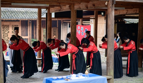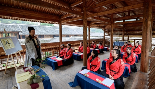 課堂正式開始前進行了一場隆重的“開學(xué)儀式”。 據(jù)《禮記》記載:“禮義之始,在于正容體,齊顏色,順辭令。”因此,第一課即是“正衣冠”。同學(xué)們換上漢服,一一站立,由先生依次檢查,然后“衣冠整齊”地排著隊集合。之后按照先生的要求,將手放到水盆中“凈手”,寓意凈手靜心,去雜存精,希望能在日后的學(xué)習(xí)中專心致志、心無旁騖。步入學(xué)堂后,舉行拜師禮,同學(xué)們向至圣先師孔子三叩首、進獻“釋菜禮”,寓意尊師重道、勤奮好學(xué)。
